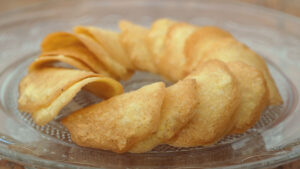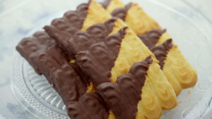 Erna, Ine, Tim en Zeinab beginnen met het maken van tuiles. Dunne amandelkoekjes in een gebogen vorm, ook wel ‘amandelkrullen’ genoemd. Vervolgens staat er een chipolatataart op het menu. De bakkers geven er allemaal hun eigen unieke twist aan.