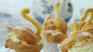 Erna, Francis, Maarten en Shelby starten met de technische opdracht. Dat zijn in de vierde aflevering zwanensoezen. Het pronkstuk is een heuse bloementaart.