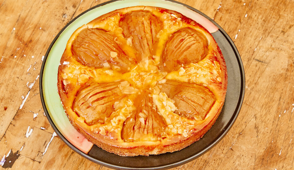 De Bourdaloue perentaart is een taart die bestaat uit een harde wenerdeeg, frangipane en gepocheerde peren. Met dit recept maak je alles zelf. Van de suikerbouillon om de peren in te garen, tot aan de abrikozenjam waar de taart mee bestreken wordt.