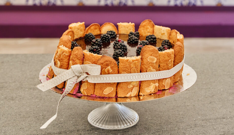 “Je ziet dat ik mijn stuk helemaal opgegeten heb”, zegt Janny over deze Charlotte Russe van Jip. En dat zegt genoeg! De combinatie van bramen en amandel werkt heel goed in dit dessert.