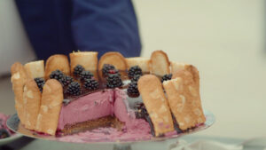 - Verdeel de bramenbavarois over de afgekoelde taartbodem en laat opstijven in de koelkast.