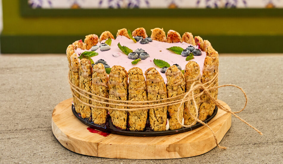 - Maak de taart af door de bosbessen bovenop te verdelen samen met de blaadjes munt.
