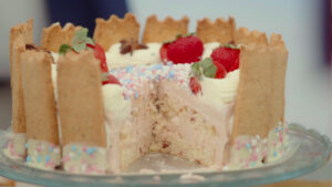 - Bestrooi de slagroom met muisjes, venkel-sprietjes (optioneel) en de aardbeien waar de kroontjes nog aan zitten.