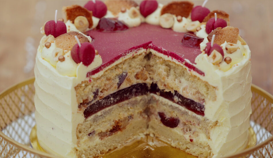 - Garneer met de marsepeinen kersjes, stukjes bitterkoek, hazelnoten en kersengelei ruitjes.