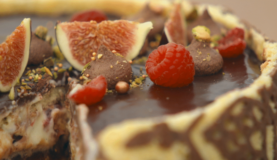 - Vul de taart verder met de romige pistachevulling. Verdeel hier een laagje frambozencoulis en schijfjes van 1 vijg over.