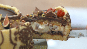 Ine sleept de complimenten van de jury binnen met deze decoratiebeslagtaart met dadel, pistache en framboos. “Hij is verrukkelijk hè? Heerlijke taart”, zegt Robèrt na de eerste hap. “Het is mooi in balans, ik vind het echt lekker.” Ook Janny is zeer te spreken over zowel de binnenkant als de buitenkant van deze Dubaitaart. “Het is gewoon een taart waar je mee voor de dag kunt komen”, eindigt ze.