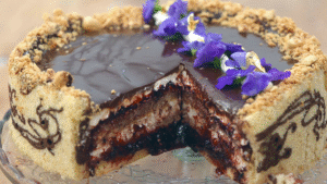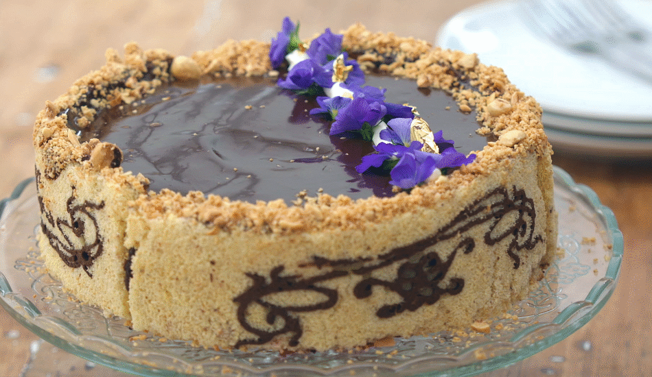 - Versier de bovenkant van de taart met eetbare viooltjes.