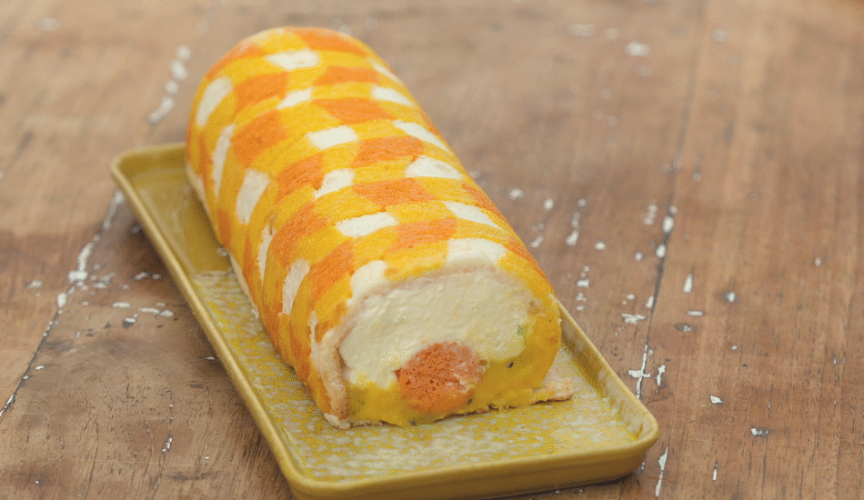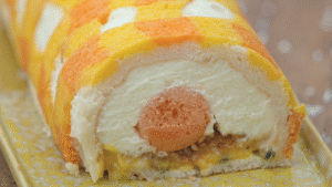 - Spuit hier een laagje mango-passievruchtcurd overheen.