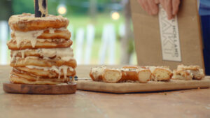 De donuttoren van Daan bestaat uit donuts met koffie- en theevulling. Vooral de koffiedonuts vallen goed in de smaak bij de jury. “De koffiesmaak is heel goed”, zegt Janny.
