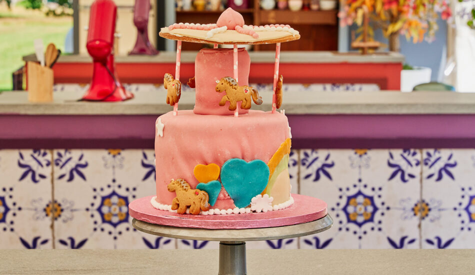 - Smeer de taart verder af met botercrème en verdeel de marsepein er omheen.