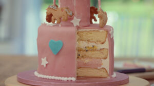 - Leg de laatste cakeplak erop en smeer af met botercrème.
