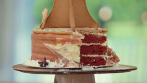 - Bouw voor de onderlaag de 3 lagen red velvet op en smeer op iedere tussenlaag wat van de roomkaascrème.