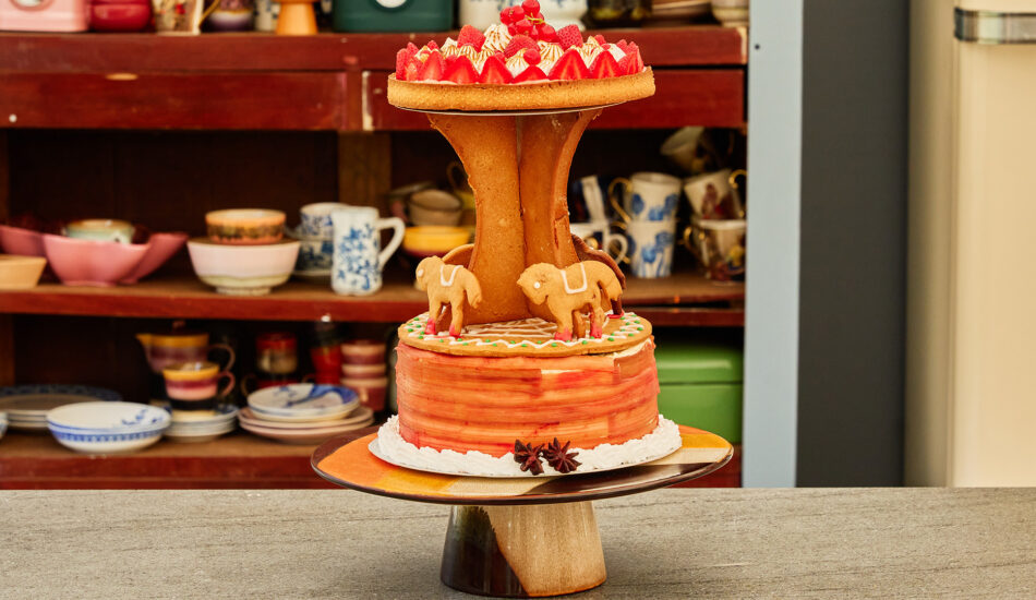 Tom mag trots zijn op zichzelf, volgens de jury. Janny is onder de indruk van de rand van de taart die gemaakt is van gepocheerde rabarberlinten. Robèrt is dol op de tartelette bovenop de draaimolentaart.