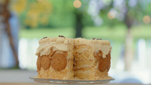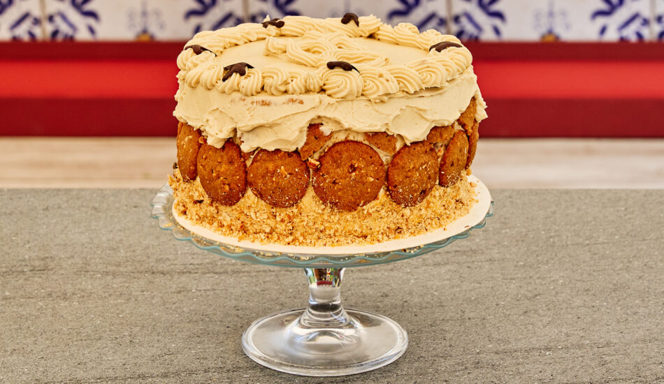 - Strijk een laag biscuit in met trempeersiroop, een laag tonkaboonbotercrème en nougatine. Leg hier een laag biscuit bovenop en herhaal deze stap tot de taart helemaal is opgebouwd. Zorg dat de taart ongeveer 20 centimeter hoog wordt.