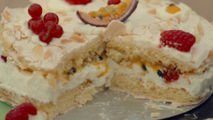 - Verdeel de slagroom en passievruchtencoulis over de taartbodem en leg de andere helft erop.