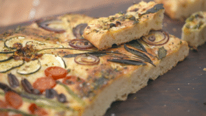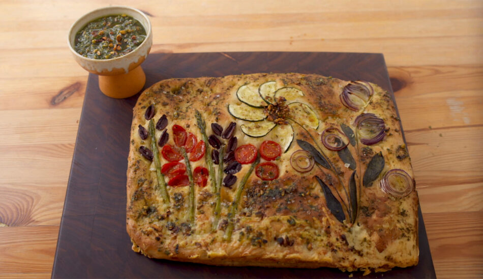 - Decoreer de focaccia met de gesneden groenten en kruiden.