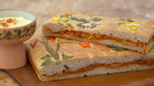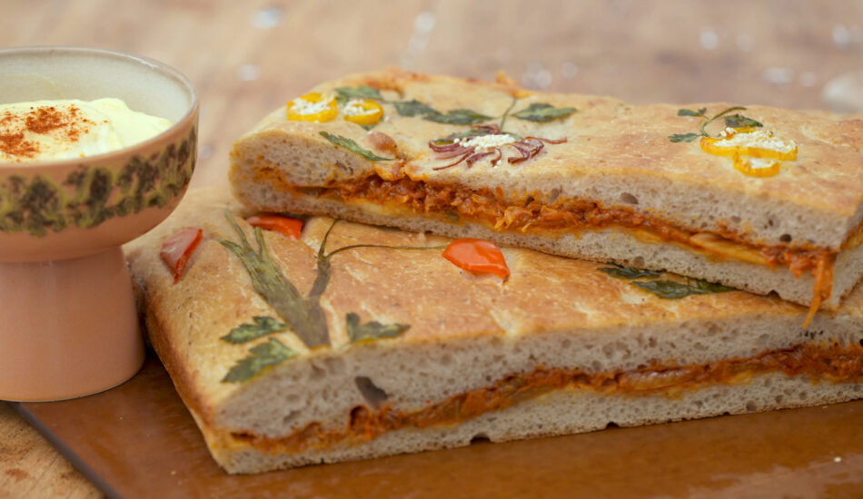 Deze focaccia tuin is een echte blikvanger op de borrelplank. Maar… dan heb je de echte verrassing nog niet gehad! Want als je de focaccia doorsnijdt, komt de echte surprise pas tevoorschijn! Je vult deze Italiaanse klassieker met een heerlijke Aziatische vulling. En ook al kan de smaak van kimchi soms een beetje prikkelend zijn, ‘deze focaccia eet lekker makkelijk weg’, aldus Janny.