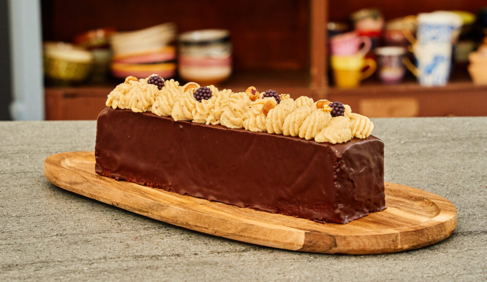 - Plaats de chocolade hazelnoten op de cake en maak ‘m af met een paar losse hazelnoten.