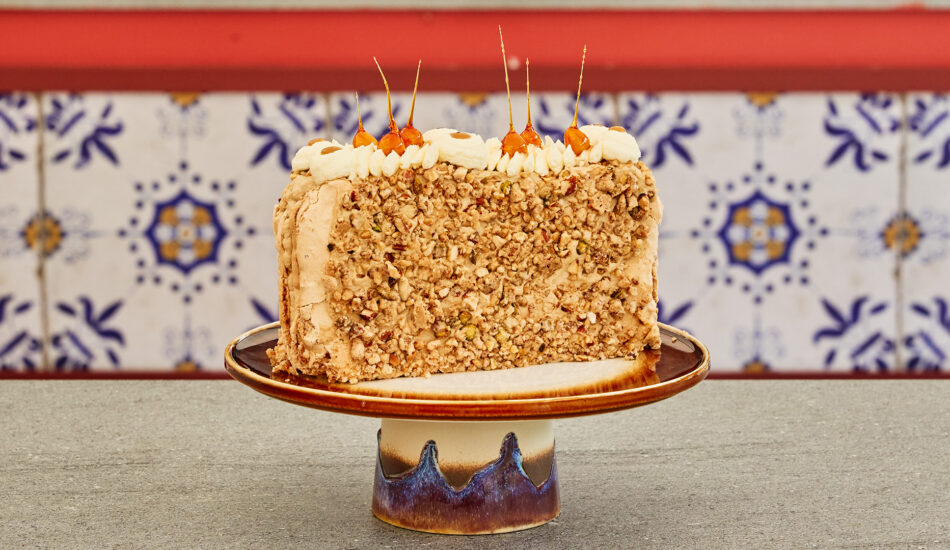 - Duw de fijngehakte geroosterde notenmix tegen de zijkant van de taart voor een krokante rand.