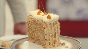 Tom zet een taart neer met een klassieke mokkasmaak. “Die is goed”, zegt Janny. Volgens Janny hadden er iets minder noten in gemogen, terwijl Robèrt dat juist lekker vindt. “Omdat het echt anders is dan wat je gewend bent”, zegt hij.