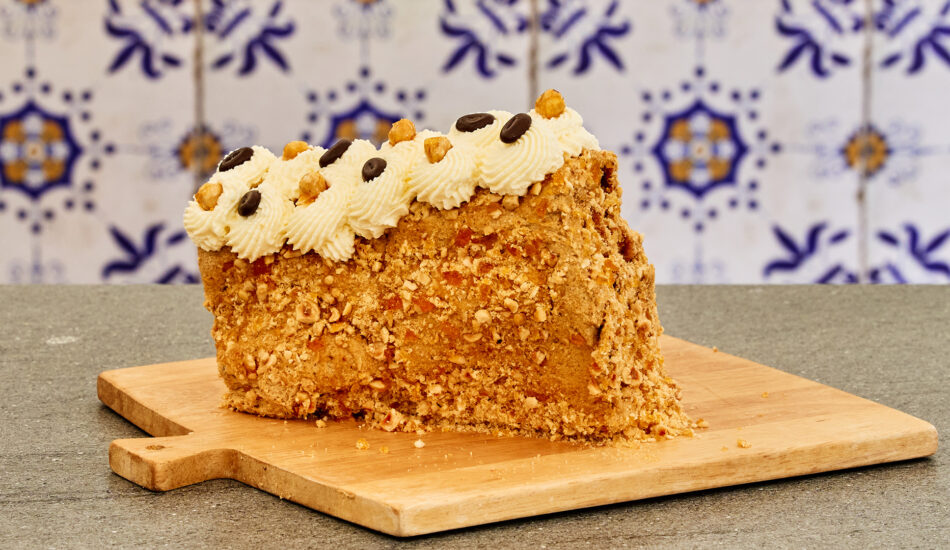 - Kantel de taart na het koelen, zodat de hazelnootschuimplakken verticaal te zien zijn.