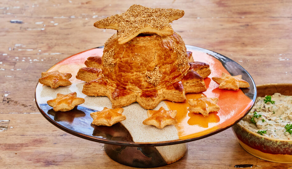 Een pasteitje met champignonragout is een echte kerstklassieker. Deze variant van Robèrt is extra feestelijk, omdat het pasteitje transformeert in een grote kerstige slaapmuts. Hij wordt afgemaakt met een dakje en extra versieringen van bladerdeeg sterren.