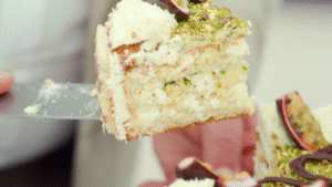 - Spuit toefjes slagroom op de bovenkant van de taart en werk het af met passievrucht partjes als decoratie.