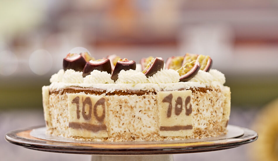 - Spuit toefjes slagroom op de bovenkant van de taart en werk het af met passievrucht partjes als decoratie.