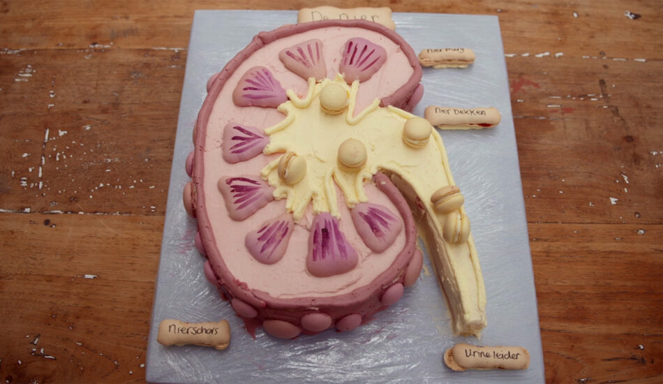 De jury is onder de indruk van de bijzondere taart die Kim heeft neergezet. Een taart in de vorm van een nier zien ze voor het eerst bij Heel Holland Bakt. Ook van binnen ziet de taart er prachtig uit met mooie laagjes. De macarons zijn goed gelukt en de passievrucht valt zeer goed in de smaak.