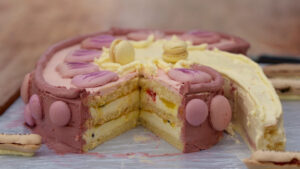 - Smeer de bovenkant van de taart af met de frambozenbotercrème en zet koud.