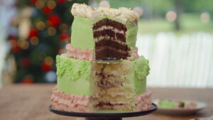 - Leg er nog een laag cake op en smeer af met de botercrème met roze kleurstof en gevriesdroogde frambozen.