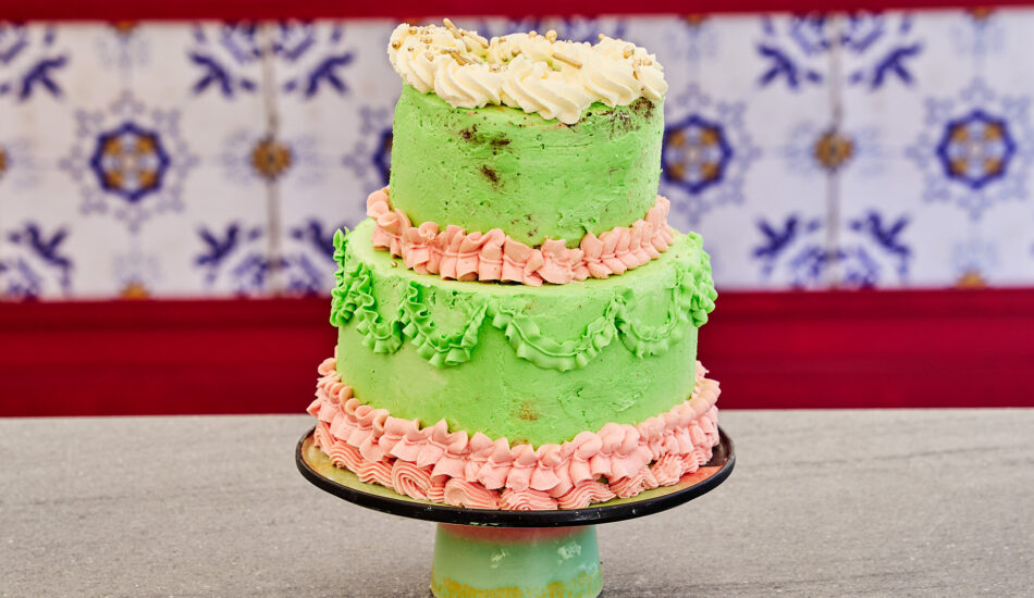 - Leg er nog een laag cake op en smeer af met de botercrème met roze kleurstof en gevriesdroogde frambozen.