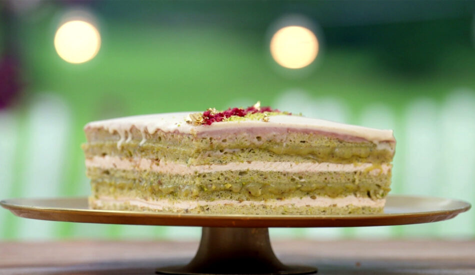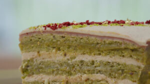 - Decoreer de taart met gevriesdroogde framboos en pistachepoeder.