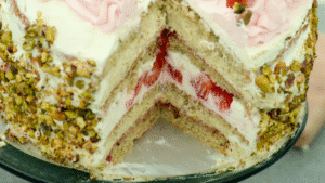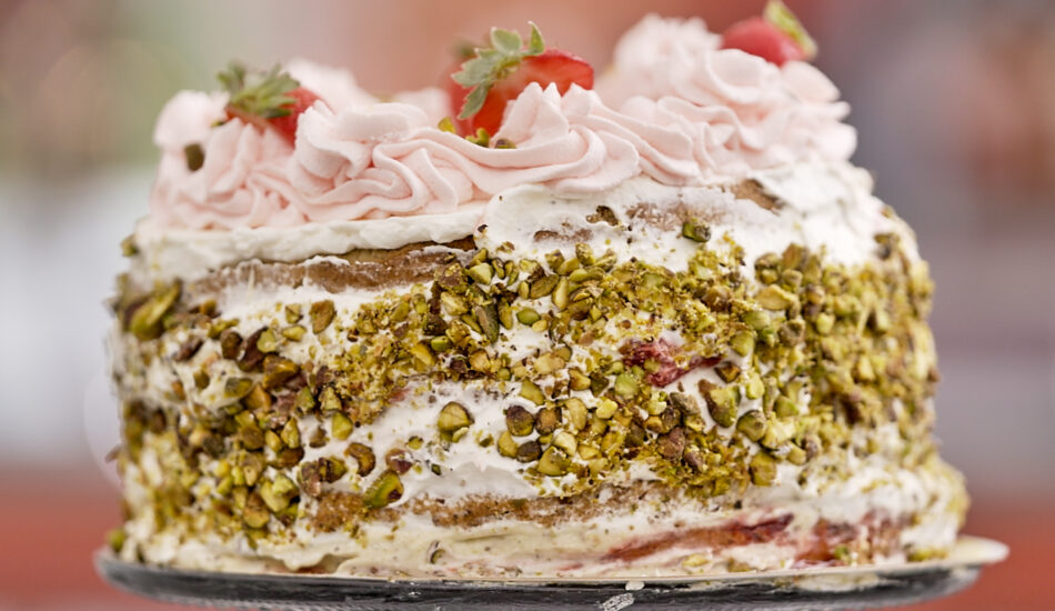 Deze pistache slagroomtaart heeft de perfecte smaakverhouding tussen pistache, matcha en Zwitserse banketbakkersroom. Het is niet te zoet en de smaken komen heel goed naar voren, maar eigenlijk zoals Janny het zegt: “Het is verdraaid lekker!”