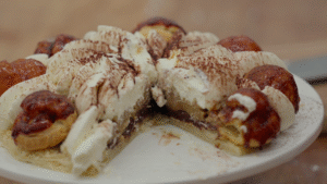 - Spuit de tiramisu vulling op de taart met de saint honore spuitmondje.