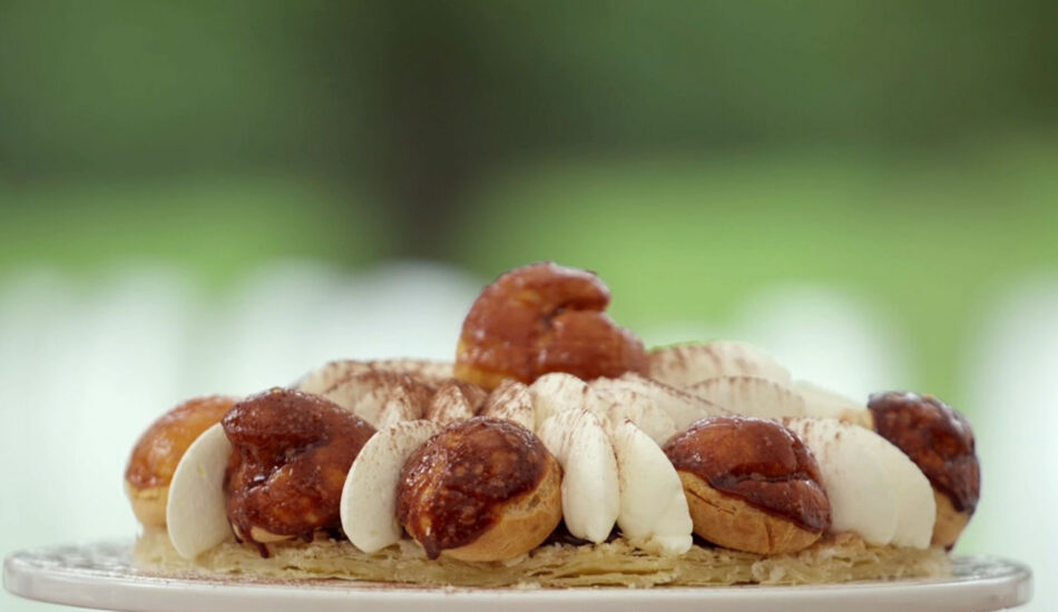 - Decoreer de taart. Leg de laatste soes in het midden op de taart.