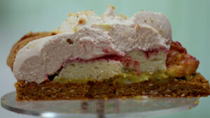 - Spuit hier de frambozenroom op met een Saint Honoré spuitmondje.