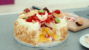 - Versier de slagroomtaart met aardbeien, stukjes passievrucht en de chocolade decoratie.