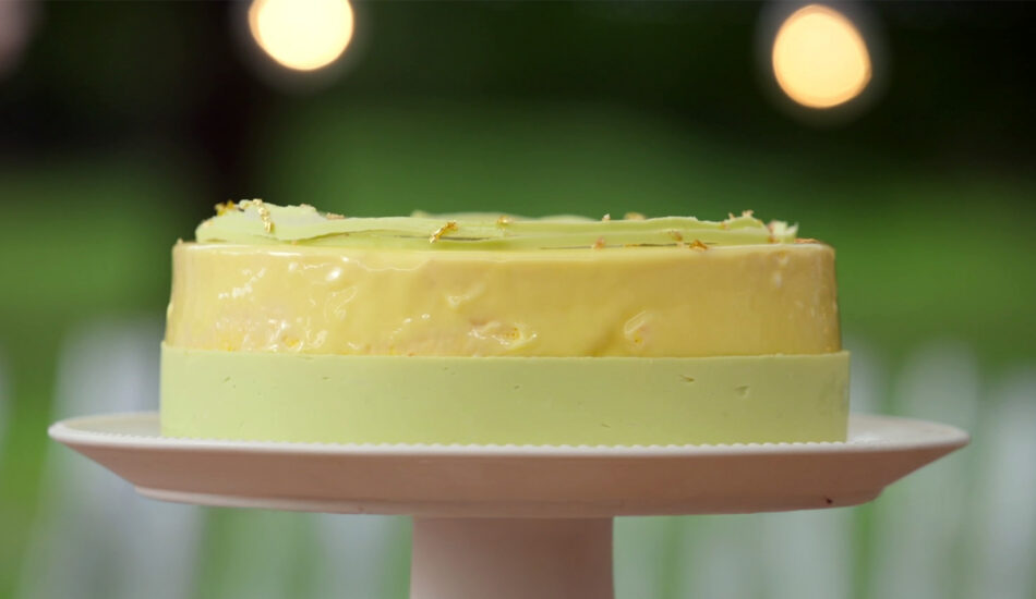 - Haal de taart uit de vorm, strijk de boven- en zijkanten glad met een paletmes en giet het spiegelglazuur bij 26 graden over de bevroren taart. Tip: De uiteindelijke ideale temperatuur voor het glazuur is ook afhankelijk van hoe bevroren je taart is en wat je kamertemperatuur is. Als de taart minstens een nacht in de diepvries heeft gestaan en je kamertemperatuur is ongeveer 20 graden dan zal 26 graden een goede temperatuur zijn om te gieten.