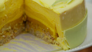 Zeinab neemt een risico door een grote spiegeltaart te maken in twee uur, maar het resultaat mag er zijn. De kleuren zijn prachtig, de smaak is fris en romig en Robèrt is gek op de mango cremeux.