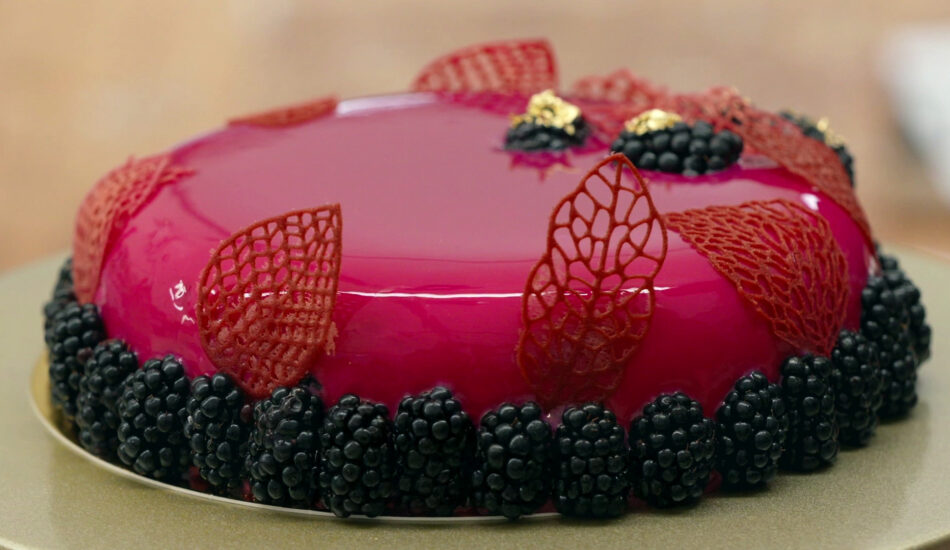 - Decoreer de taart met een randje bramen, de páte á Cigarette en bladgoud.