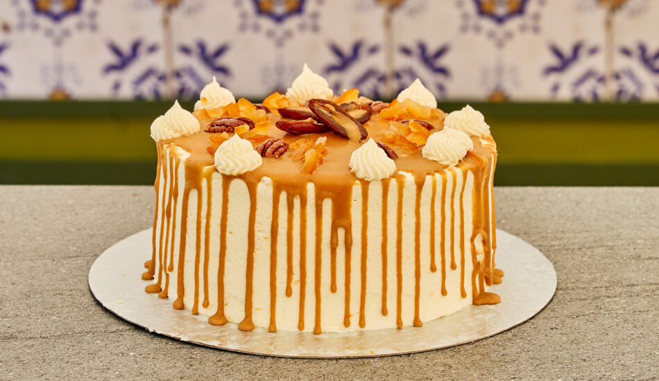 - Smeer de taart af met de sinaasappelbotercrème.