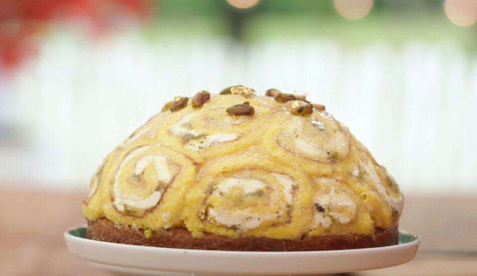 - Rol de opgerolde biscuitplak uit en bestrijk met lemoncurd en breng met het kleine ronde spuitmondje strepen pistachepasta aan.