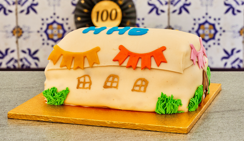 - Maak van de overige kleuren marsepein een vlaggetjesslinger en drapeer deze over de tent.