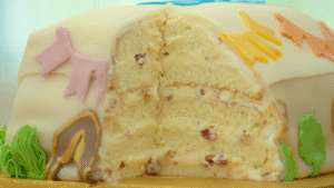 - Bestrijk de hele taart met een dunne laag stevig opgeklopte slagroom en bekleed de gehele tent daarna met een dunne laag naturel marsepein.