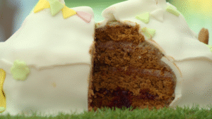 Deze taart noemt Bianca niet voor niets ‘Drent in de tent’; de tent taart wordt namelijk gemaakt van Drentse turfkoek. De lagen van de taart zijn opgevuld met kersen en witte chocoladeganache met hojicha.