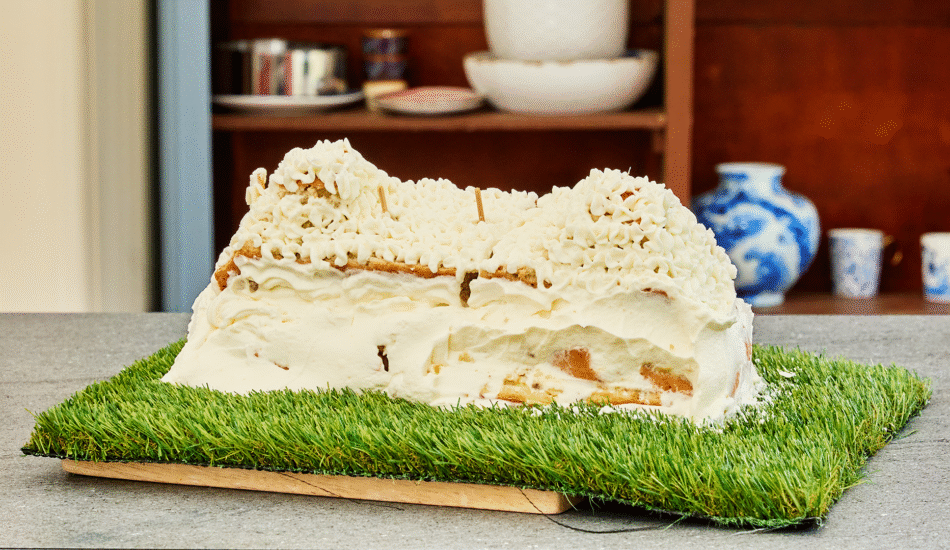 Jip serveert de jury een tent taart gemaakt van kokoscake. Deze heeft hij opgevuld met een heerlijke mango-ganache, kokos-limoenmousse en gekarameliseerde pecannoten.