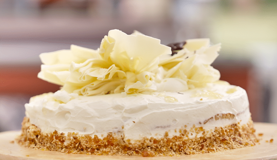 - Maak de taart af door de nougatine aan de zijkant te drukken. Doe dit niet op de gehele zijkant maar slechts op een deel van de onderkant van ong. 2-3 centimeter hoog.