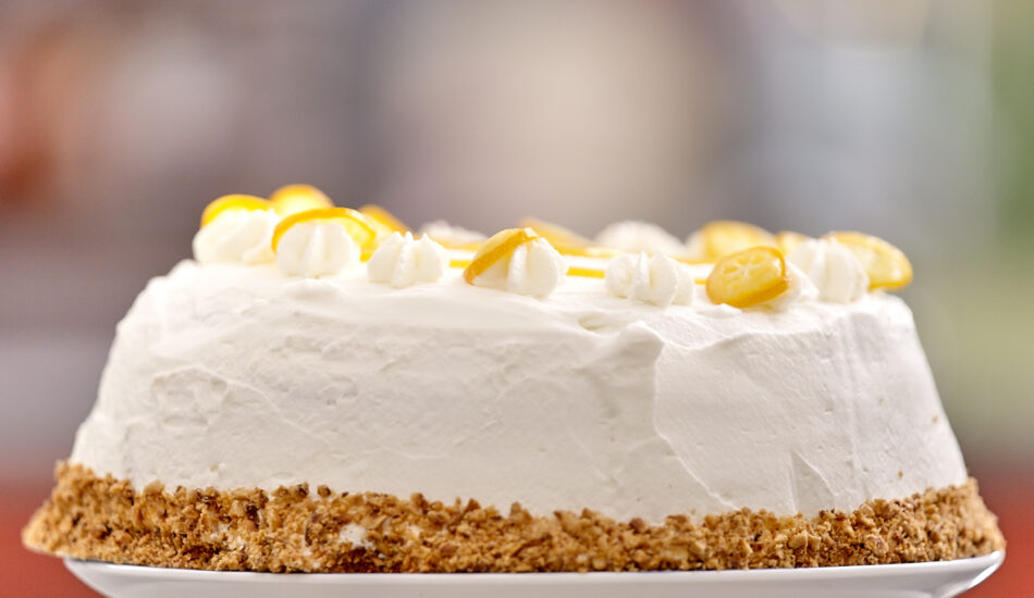 - Werk de taart af met dunne plakjes kumquat, die je mooi tussen de toefjes slagroom verdeelt.