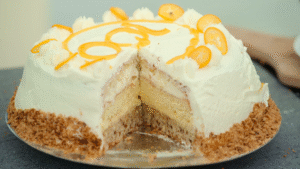 Elke hap is een verrassing van fris, zoet en nootachtig, precies in balans. Deze taart wordt afgewerkt met een rand van knapperige hazelnoot crumble, passievruchtgel en glanzende kumquatplakjes. Een vrolijke, zonnige taart die net zo feestelijk smaakt als hij eruitziet en de juryleden vinden dit allemaal een hele mooie taart!